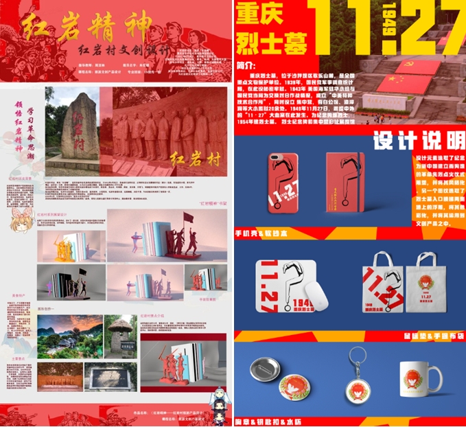 党的历史是最生动、最有说服力的教科书。对我们新时代共产党人来说,中国革命历史是最好的营养剂。被称为“山城”的重庆,独特的地理环境,孕育出自然、人文景点300余处。在作品展中,学生们分小组围绕重庆当地的红色旅游景点做了相关调研和一系列的旅游产品设计。作品着眼于文旅产品设计的创新与突破,教师更多的在于“导”,引导学生培养创造性和审美能力,注重提升学生传统与时尚,旅游和文化相结合的能力,让作品更具自身特性。 希望通过旅游产品设计作品展,能够让大家足不出户便能领略重庆的风情魅力,展现永远热爱党、永远跟党走的坚定信念。