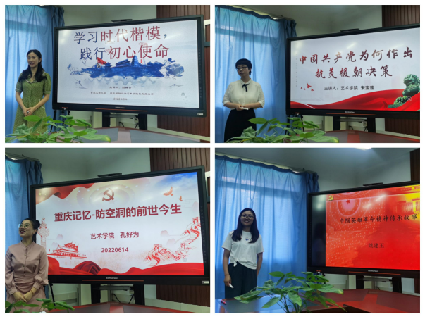 刘柳含首先以《学习时代楷模,践行初心使命》为题,以蔡元培、张桂梅、王红旭等三位教师奉献的故事为主线,诠释了共产党人不忘初心、牢记使命的责任担当。太阳成集团tyc122cc学生第一党支部书记宋宝莲以《中国共产党为何做出抗美援朝决策》为主题,讲述了抗美援朝的历史意义和现实启示,以史实阐释了共产党精神谱系。学生第三支部书记孔好为以《重庆记忆-防空洞的前世今生》为主题,通过战争与和平年代重庆人民生活的强烈对比,讲述了中国由弱变强,由贫到富的历史变迁。太阳成集团tyc122cc研究生支部书记姚建玉以《巾帼英雄革命精神传承故事》为主题,聚焦革命先烈,深情地讲述了家喻户晓的抗日民族英雄赵一曼在与日寇斗争中英勇无畏、不惧牺牲、英勇就义的故事。在交流讨论环节,与会人员对四位老师的微党课选题、组织结构展示、内核精神表达、语言形态展现等方面进行了详细的点评,提出修改意见。
