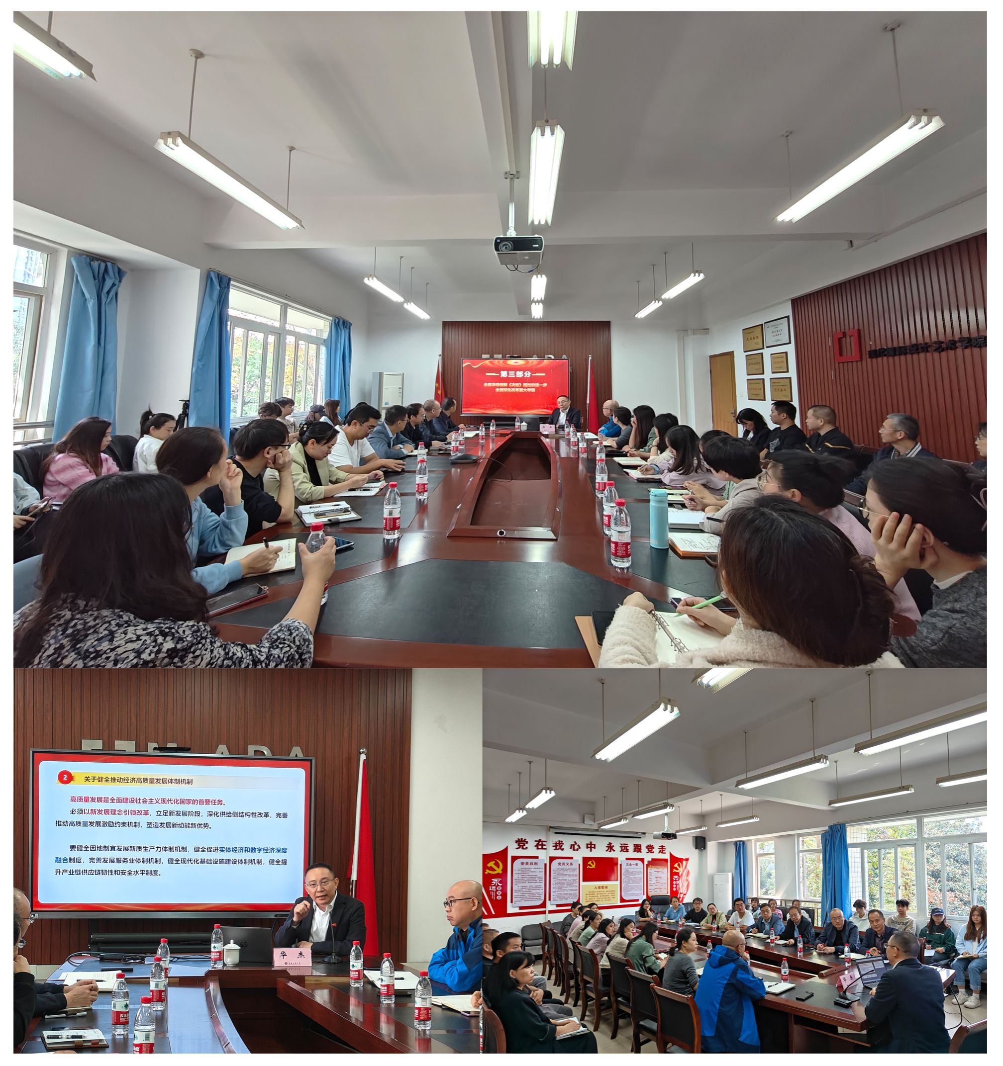 10月15日上午,学校宣讲团成员、党委常委、党委统战部部长华杰在兰花湖片区崇德楼313会议室作学习贯彻党的二十届三中全会精神宣讲报告。太阳成集团tyc122cc、现代国际设计太阳成集团tyc122cc全体党委(党总支)委员、班子成员、专职组织员、党支部书记、系主任、科室负责人及师生代表共计40余人参加宣讲会。宣讲会由艺术两院党委(党总支)书记唐玺主持。