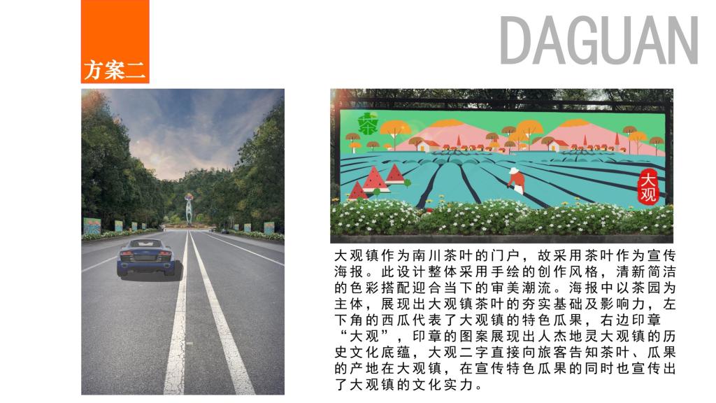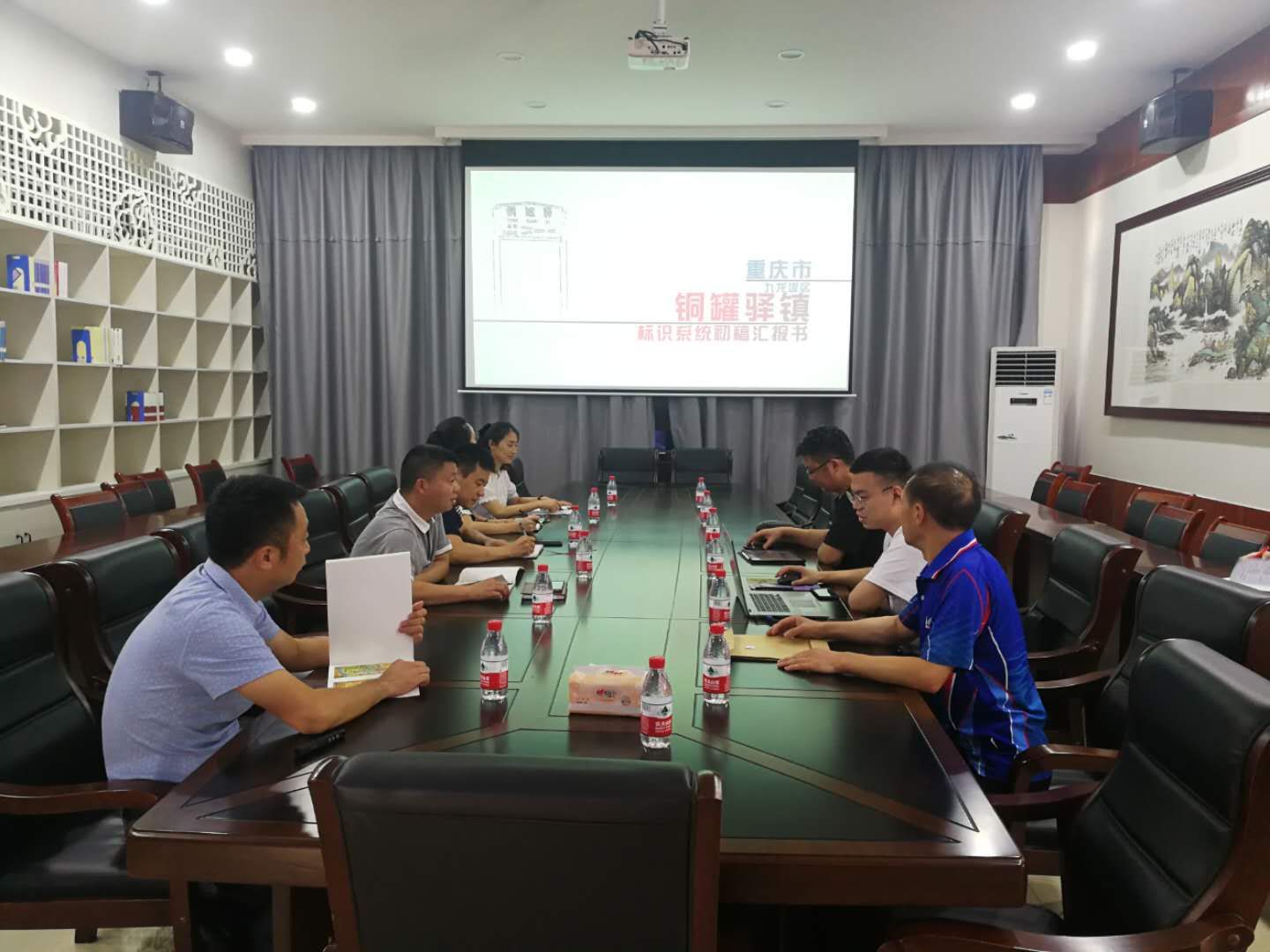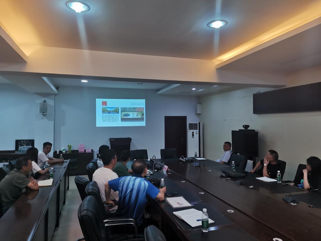 8月3日,8月7日,团队苏自兵副教授带队一行5人先后前往九龙坡区铜罐驿镇、南川区大观镇。在铜罐驿镇,团队将设计的铜罐驿古镇LOGO、文旅标识标路牌、铜罐驿古镇手绘地图等设计初稿向铜罐驿镇委镇政府作了专题汇报,汇报后进行了深入的提案讨论,镇党委赵顺平书记对重庆工商大学及团队师生在短时间高质量完成的规划设计表示了赞赏和感谢,并提出了深化设计的若干意见,双方还就方案提升沟通了后续规划设计的有关工作。在大观镇,团队将大观镇高速路口、樱花大道外墙、茶园一棵树景区设计初稿向大观镇委镇政府做了细致汇报,镇党委郑小军书记仔细认真的听取了团队汇报并详细了阅读了设计初稿册,对贴近大观实际进行的规划设计,郑书记表示十分赞赏,并代表大观镇政府提出了细化修改意见,团队悉心听取了特别关于设计服务产业对接,锚定大观布局发展靶向的若干建议并均作了详细记录。