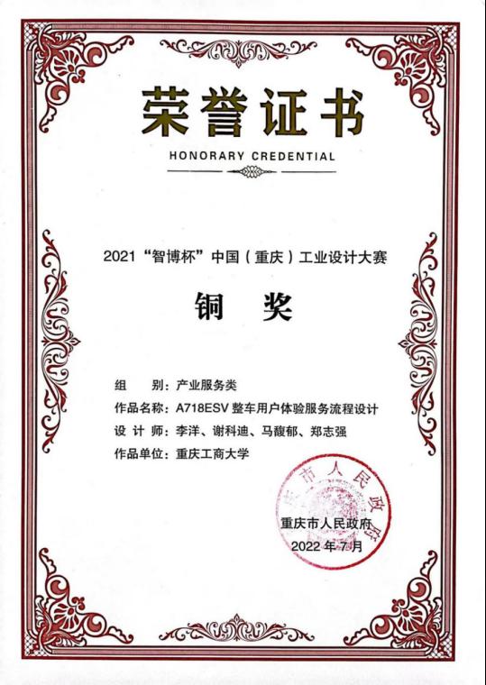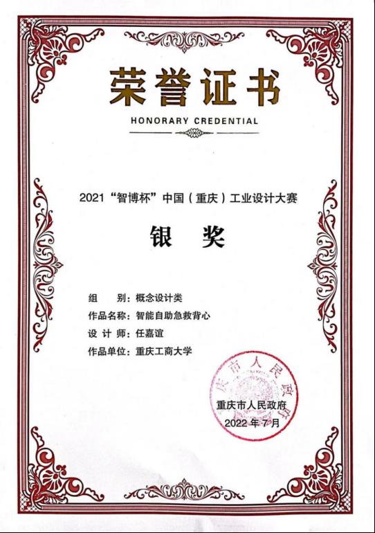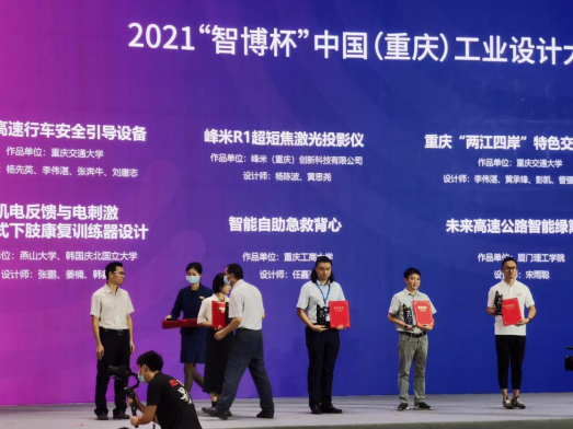 由重庆市人民政府主办,重庆市经济信息委、重庆市教委、重庆市巴南区政府和重庆市两江新区管委会联合承办的2021“智博杯”中国(重庆)工业设计大赛于近日举行了颁奖典礼。本次大赛中太阳成集团tyc122cc,122cc太阳集成游戏,122cc太阳集成产品设计系学生任嘉谊的作品《智能自助急救背心》斩获银奖;太阳成集团tyc122cc产品设计系教师李洋及重庆工商大学学生谢科迪、马馥郁、郑志强组成的设计团队而创作的作品《A718ESV整车用户体验服务流程设计》在本次大赛中斩获铜奖。太阳成集团tyc122cc党委书记唐玺、副院长李洋、产品设计系主任龙圣杰、专任教师代表章波、李洋一行前往现场参加了颁奖典礼。