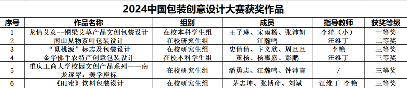 近日,2024中国包装创意设计大赛获奖名单公布,我院学生作品——《龙情艾意——铜梁艾草产品文创包装设计》 (作者:王子琳、宋雨杨、张沛妍,指导老师:李洋(小))荣获全国一等奖;《南山见物茶叶包装设计》(作者:江瀚鸣,指导老师:汪维丁)荣获全国二等奖,此外,还荣获全国三等奖4项、优秀奖6项,共计12项。