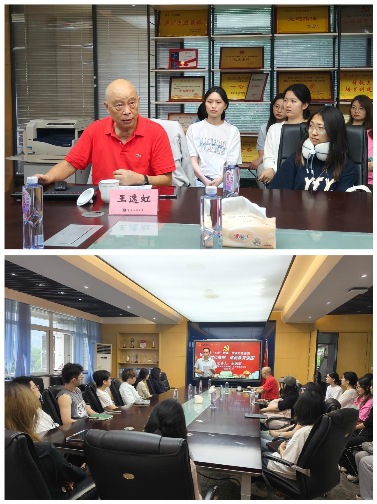 王教授还分享了自己 2002 年选择到大学当老师的经历,以及他如何通过学习成为教师的过程。他以自己的人生经历为例,向学生们阐述了“天天向上、天天向内、天天向下”的三维学习理念,鼓励学生们在大学阶段不仅要深耕专业知识,还要注重内涵发展,关注现实社会,成为适应未来社会的复合型人才。他强调,“五老”是社会的宝贵财富,他们的经验和智慧是青年一代成长的灯塔。学生们纷纷表示,老教授的分享让他们深受启发,不仅对艺术创作有了更深刻的理解,也对如何度过大学时光有了更清晰的方向。