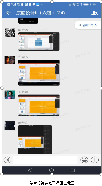 陆冀宁老师:今天主讲《产品设计分析》课程,提前将课件发给学生进行了预习,采用企业微信直播与QQ线下沟通、学校在线网络教学平台等方式进行教学,我总结了几点:1、线上教学学生更活跃、发言更大胆,交流反馈更及时;2、在线教学形式丰富,直播适合用于理论讲授,会议适合用于单独或小组辅导,在线网络平台更适合教学资料观看,作业收发等,希望借助这次机会,掌握更多更新的教学手段。