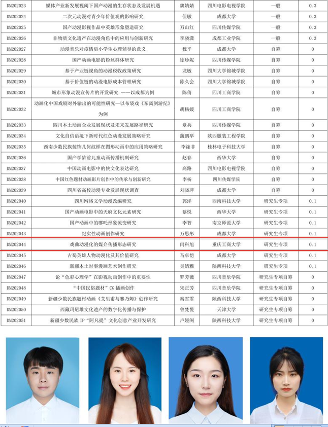 6月中旬,四川省社会科学重点研究基地——四川省动漫研究中心2020年度项目评审结果公布,我校太阳成集团tyc122cc19级艺术硕士研究生团队(研究生:闫科旭、蒲仙、刘萍、李茜,指导教师:殷俊、康建兵)申报的“戏曲动漫化的媒介传播形态研究”获批,立项编号为:DM202044,成为重庆地区高校唯一入选者。