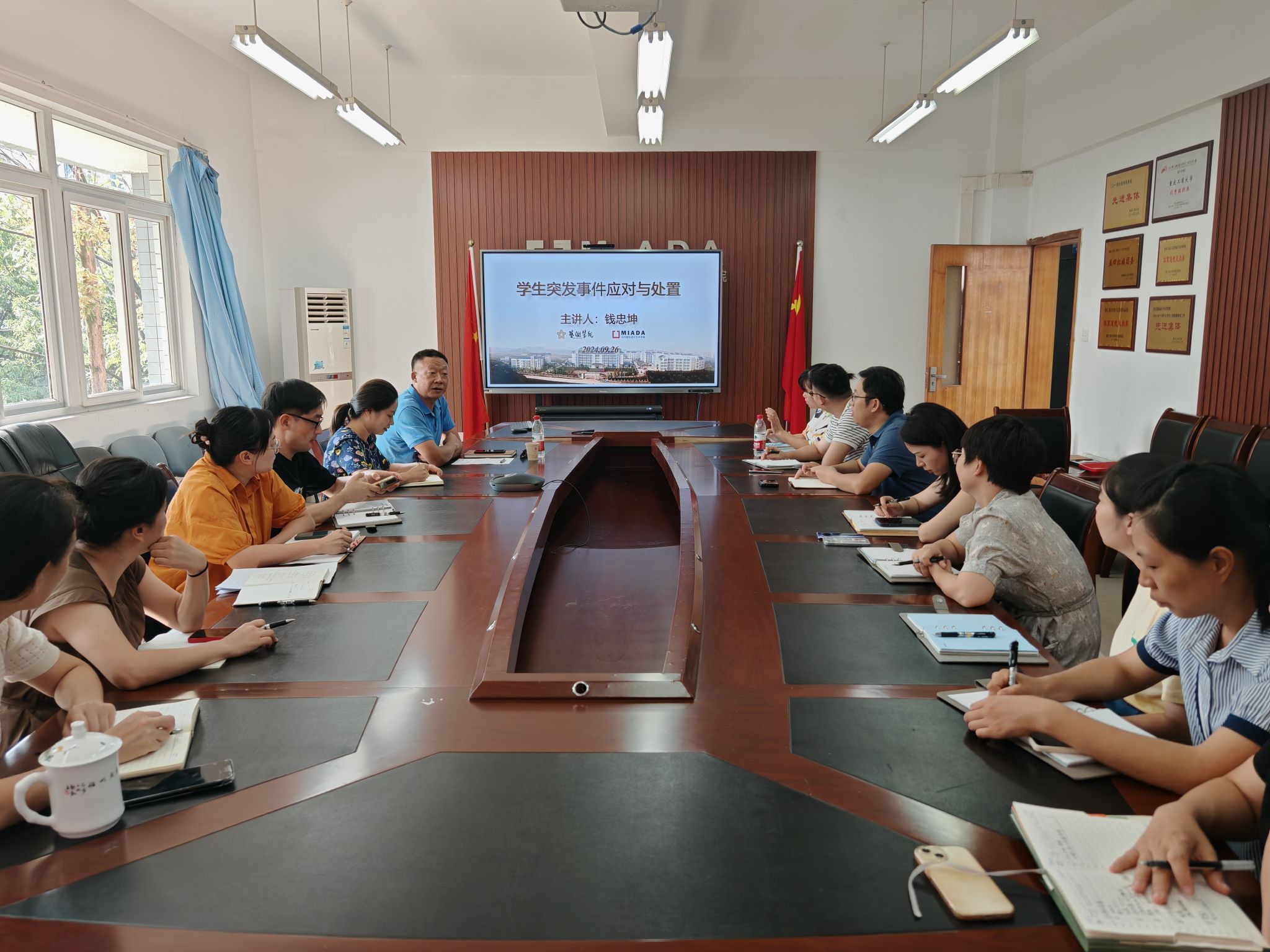 钱忠坤老师结合自身多年来的安稳工作实践经验和典型案例,在校园突发事件的类型、处理流程、事件总结与复盘等方面,系统讲解了各种突发危机事件处理中的关键要素和重点环节,并结合学生管理工作实际,就如何合情、合理、合法的处理突发事件做了详细介绍。王婷表示,辅导员应强化责任意识,在日常工作中做到“心中有数,应对有策、预防有招”,同时要注重材料的归档总结,做到有“迹”可循,不断总结经验,提升应对能力。