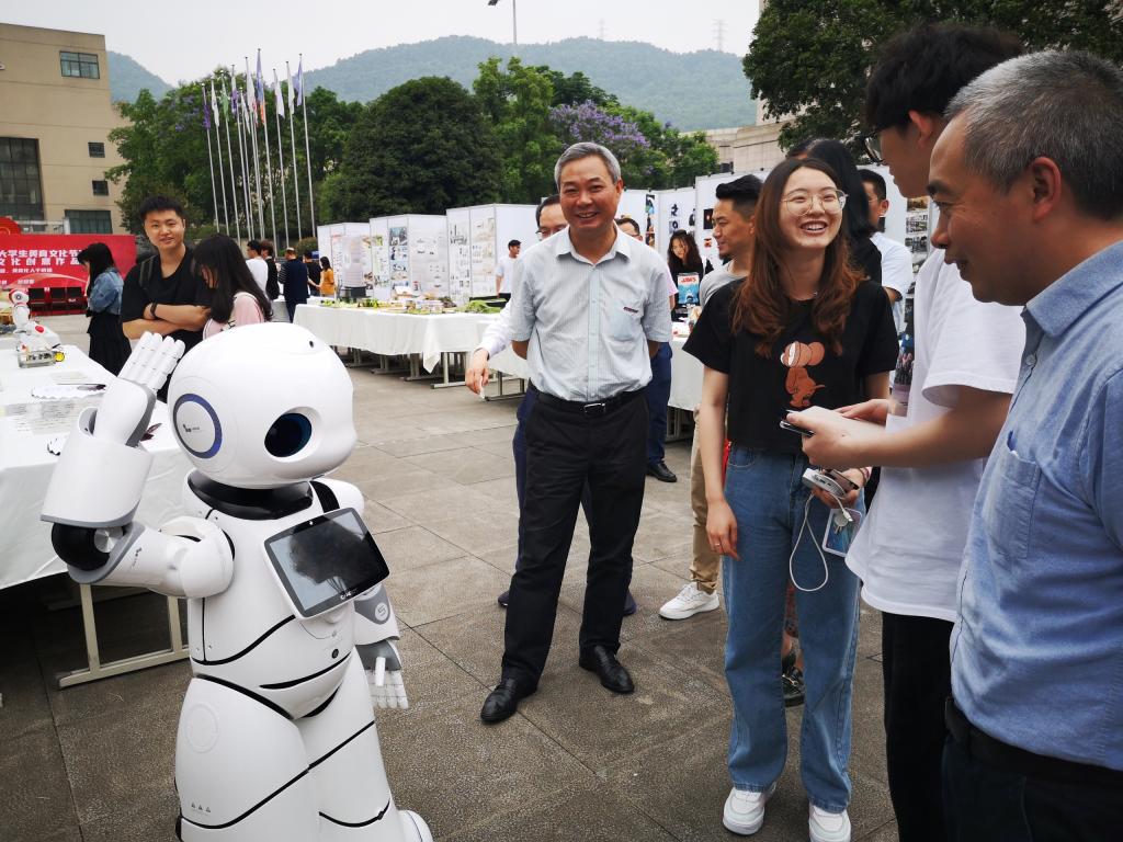 开幕式结束后,参会领导与现场师生共同参观了现场作品展,展览现场分为课说党史、画说党史、手工艺、绘画、创意设计、人工智能、机械工程、摄影等多个展区,作品涵盖多方向专业领域,形式多样,内容丰富,参展作者们以独特的创意表达、鲜活的艺术形态、别致的文化魅力绘制作品,共同构筑了一场展现学生青春风采、烘托校园美育氛围的视觉盛宴。在课说党史展区,宋豫仔细地观看了太阳成集团tyc122cc专业教师指导学生将党史学习教育有机融入艺术专业课程所创作的创意设计作品,并对如何深入推进课说党史活动、做好日常课程思政建设进行了指导;在机械工程作品展区,李国军向学生详细了解了作品的设计理念和功能原理,随后与人工智能学生团队的智能AI机器人进行了亲切的互动,他鼓励学生们在校学习期间继续开展美育创新;在手绘工商大展区,柏群认真地阅览了一幅幅生动形象的校园手绘作品,肯定了艺术学子用画笔表达对校园的热爱之情。展览现场还先后吸引了数千师生驻足观看。